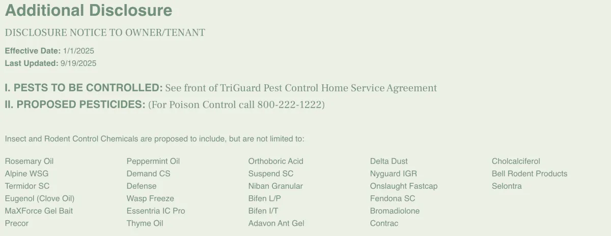UPON REQUEST, TRIGUARD WILL SUPPLY THE PURCHASER WITH A COPY OF THE MANUFACTURER’S SPECIMEN LABEL OF PESTICIDES WHICH WILL BE USED TO TREAT THE PREMISES